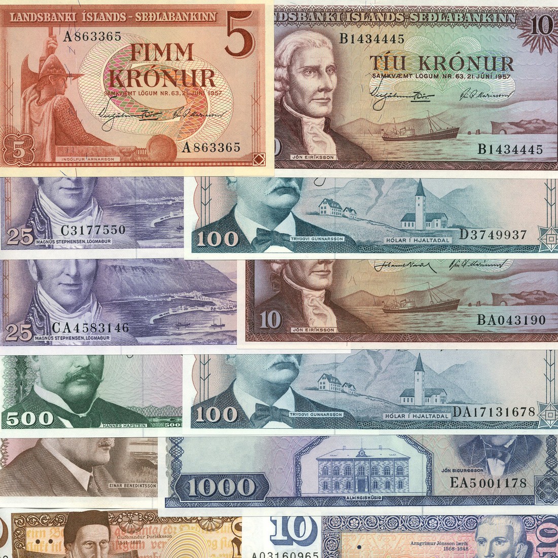 Landsbank Islands/Sedlabanki Islands, a group comprising 5, 10, 25 and 100 kronur, 1957 issue, 10, 25, 100, 500, 1000 and 5000 kronur, 1961 issue, 10, 50, 100, 500, 1000 and 5000 kronur, 1981-86 issue, 500, 1000 and 2000 kronur, 1994-00 issue, 500 (2), 1000 and 5000 kronur, 2001 issue