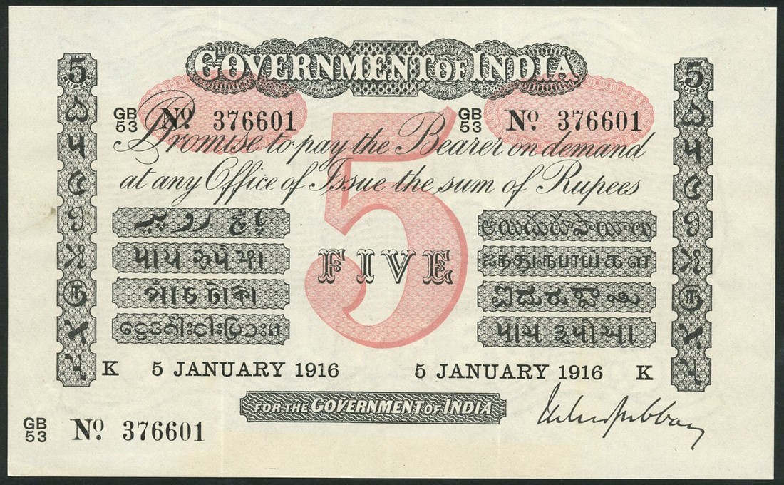 Government of India, 5 rupees, Karachi, 5 January 1916, serial number BG/53 376601, black on red underprint, value at centre, Gubbay signature