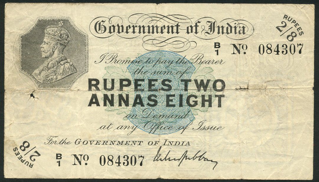 Government of India, 2 rupees 8 anna, ND (1917-30), serial number B/1 084307, black on blue and green underprint, George V at top left, value at top right and low left