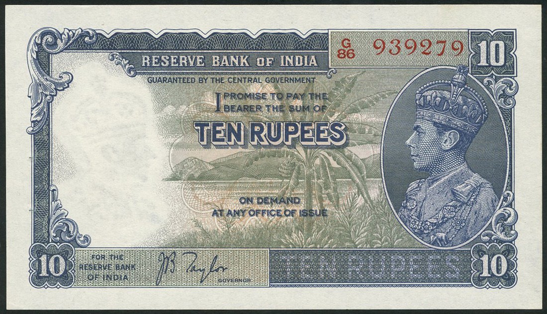 Reserve Bank of India, 10 rupees, ND (1937), serial number G/86 939279, blue on olive underprint, George VI at right, Taylor signature