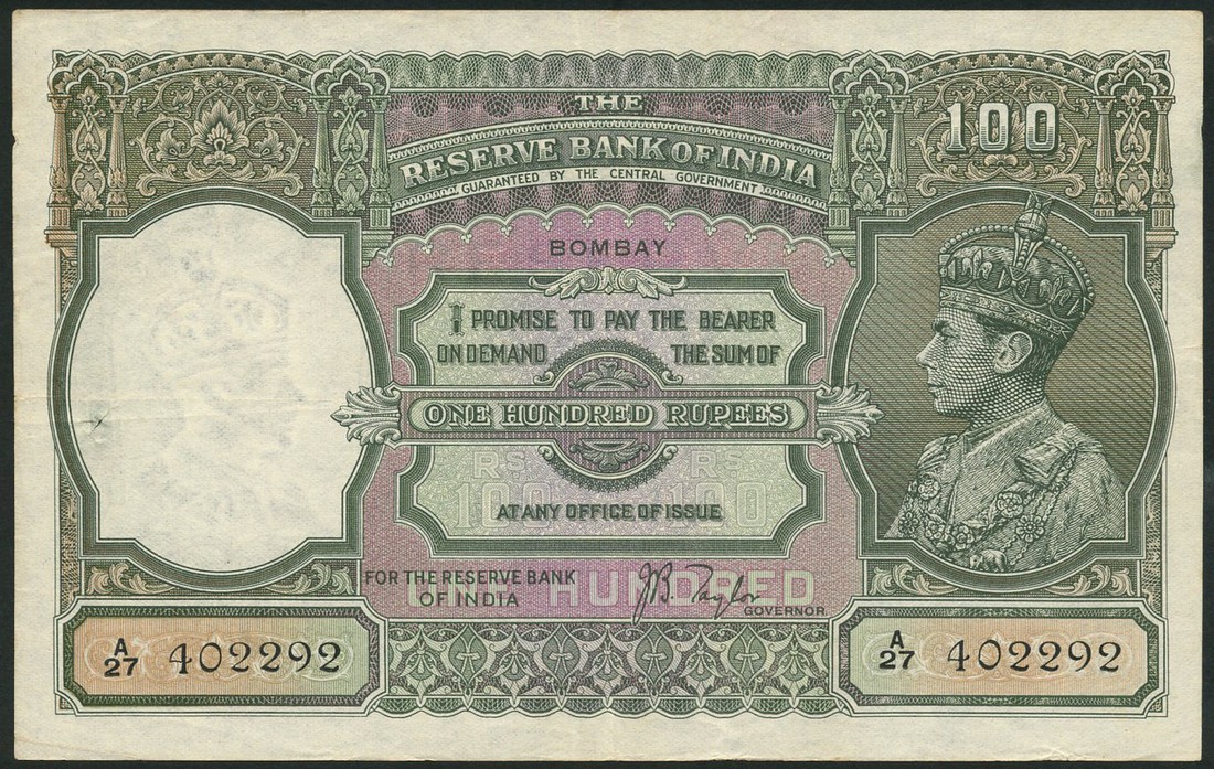 Reserve Bank of India, 100 rupees, Bombay, ND (1937), serial number A/27 402292, green on multicolour underprint, George VI at right, value at centre and top right