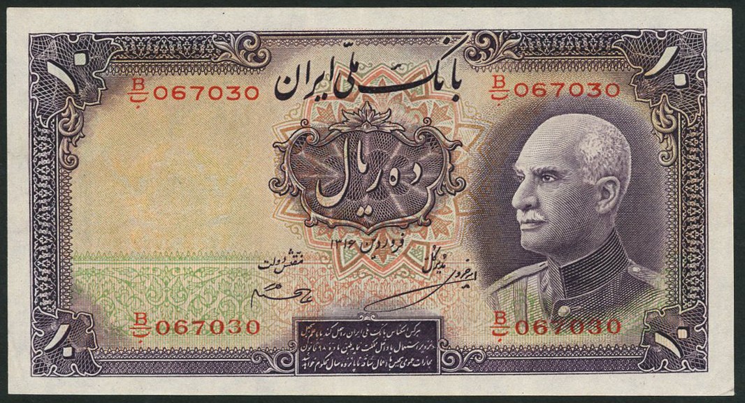 Bank Melli Iran, 5 rials (2) and 10 rials (2), AH 1317 (1938), first two red-brown, others purple, all with Shah Reza at right