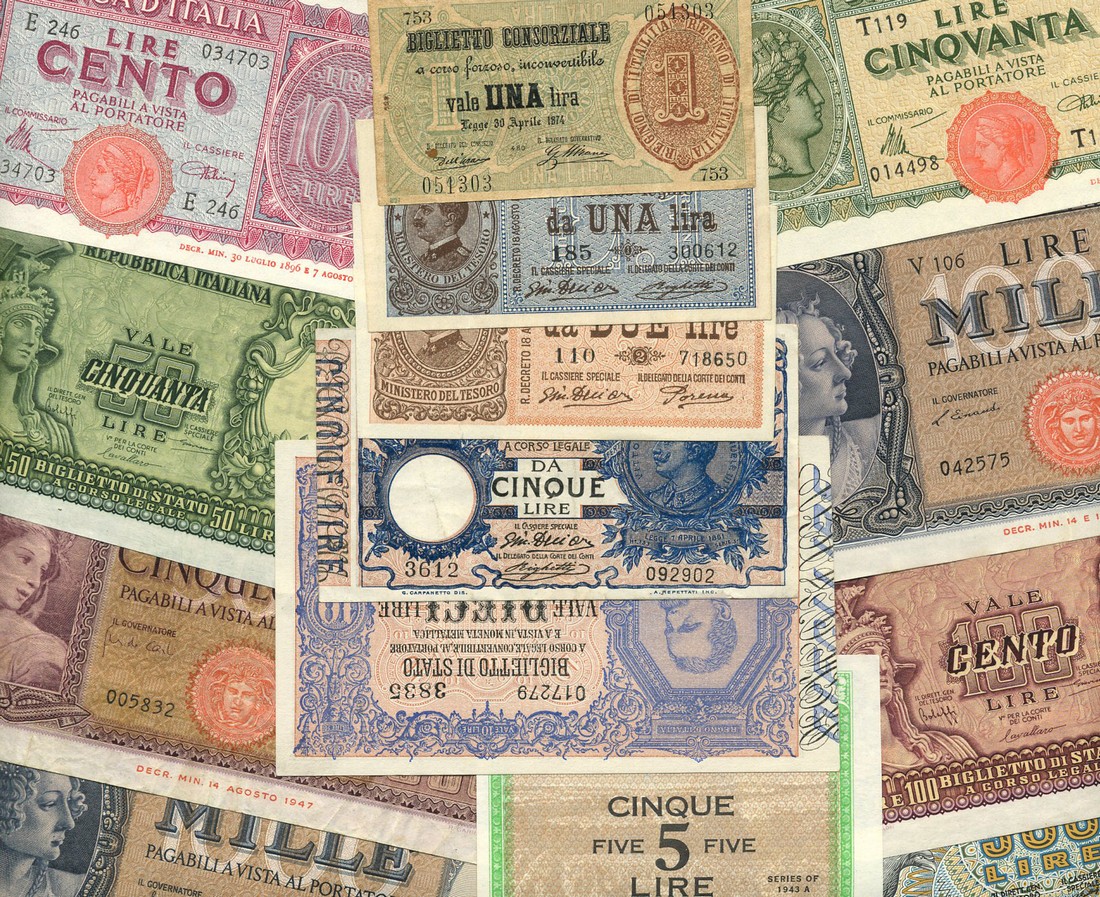 Banca D'Italia, a group of notes including, 25 lira, 22 January 1919, brown and red-orange, Italia at right, eagle above, also 5000 lira, 28 January 1948, blue, long format, Italia at left and right