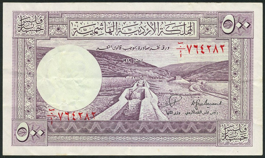 The Hashemite Kingdom of Jordan, 500 fils, L.1949 (1952), purple, irrigation ditches at centre, signature 3, reverse purple, man with cattle at centre