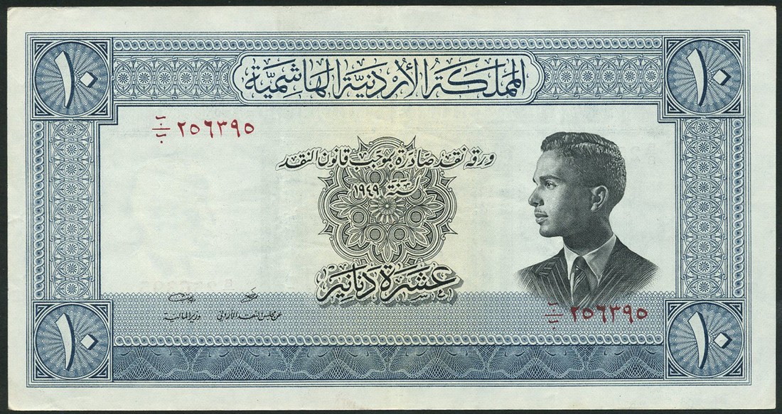 The Hashemite Kingdom of Jordan, 10 dinars, L.1949 (1952), blue, King Hussein at right, value at each corner, signature 5, reverse blue, Treasury at Petra at centre