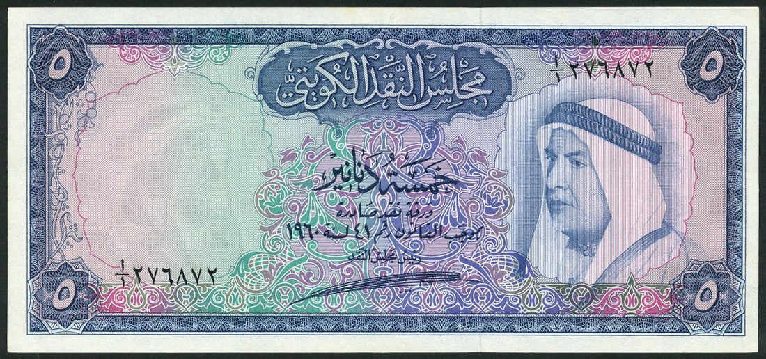 Kuwait Currency Board, 5 dinars, 1960, serial number I/1 276872, blue on multicolour underprint, Sheikh Abdullah Al-Salem Al-Saba at right, value at each corner