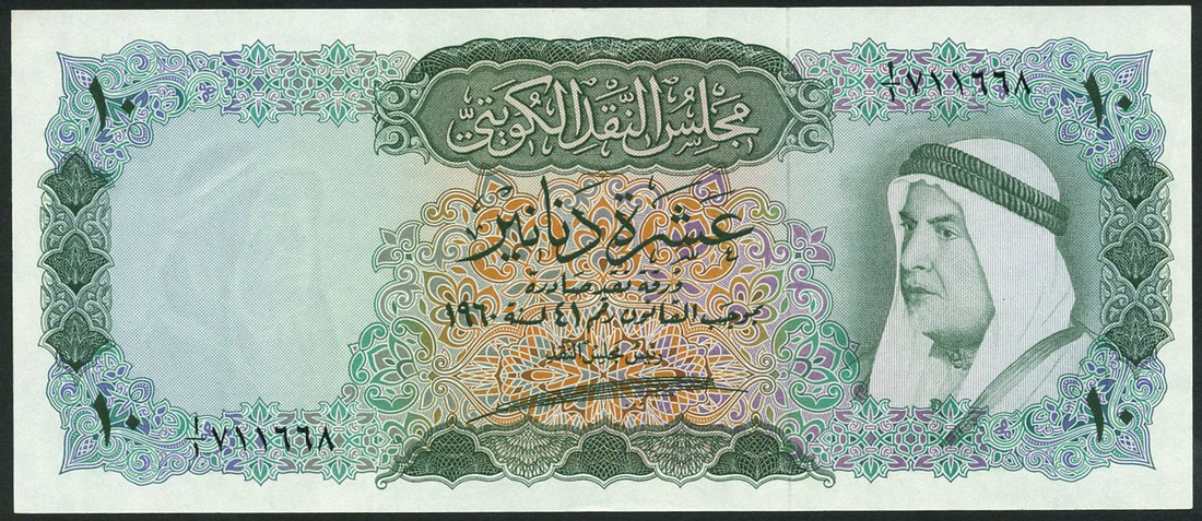 Kuwait Currency Board, 5 dinars, 1960, serial number I/1 711668, green on multicolour underprint, Sheikh Abdullah Al-Salem Al-Saba at right, value at each corner, reverse dhow in full sail