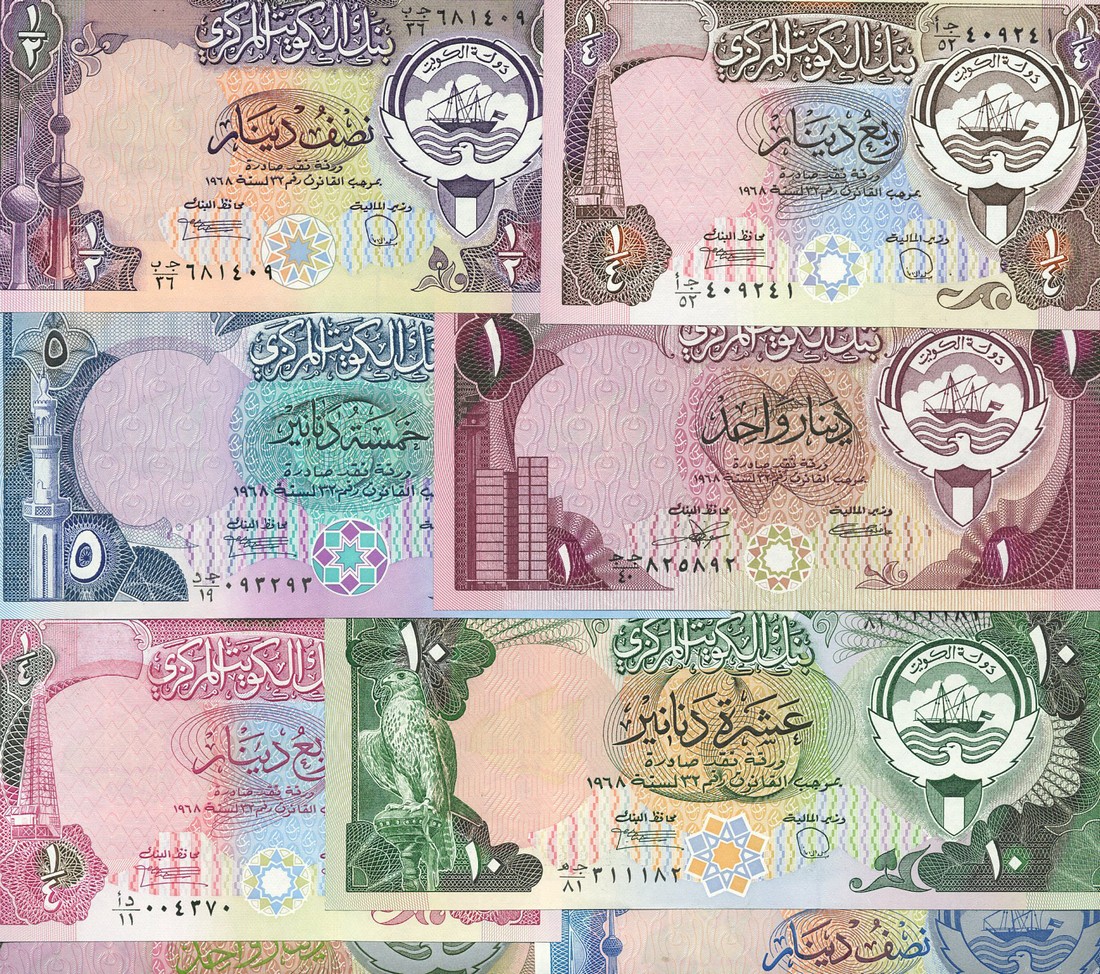 Central Bank of Kuwait, a group of the 1980-86 issue, comprising 1/4, 1/2, 1, 5 and 10 dinars, all arms at right, value at each corner, as well as a virtually complete set of the later issues