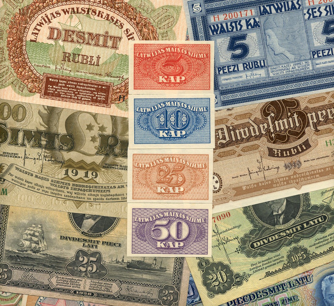 Latvia, a group of notes including, 1, 5, 10, 25 and 100 rubli, 1919, 5, 10, 25 and 50 kapeikas, 1920, 20 latu, 1925, 25 latu, 1928, 50 latu, 1934, also Riga Workers Soviet issues, 1, 3, 5 and 10 rubli, 1919, and a group of the 1992 series and onwards