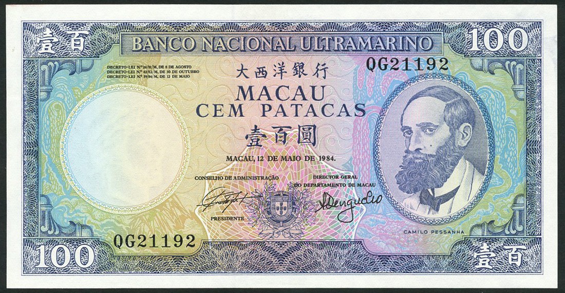 Banco Nacional Ultramarino, Macau, 100 patacas, 12 May 1984, serial number QG21192, blue and purple on multicolour underprint, Pessanha at right, also 5 and 10 patacas, both 8 August 1981, green with temple and brown with lighthouse respectively