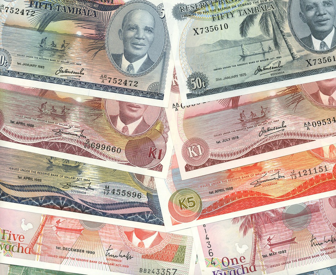 Reserve Bank of Malawi, a sizable group of mostly modern issues, but including 2 kwacha, 1971, 50 tambala (2), 1975, 1983, 1 kwacha (2), 1978, 1988, 4 kwacha, 1988 and 10 kwacha, 1988