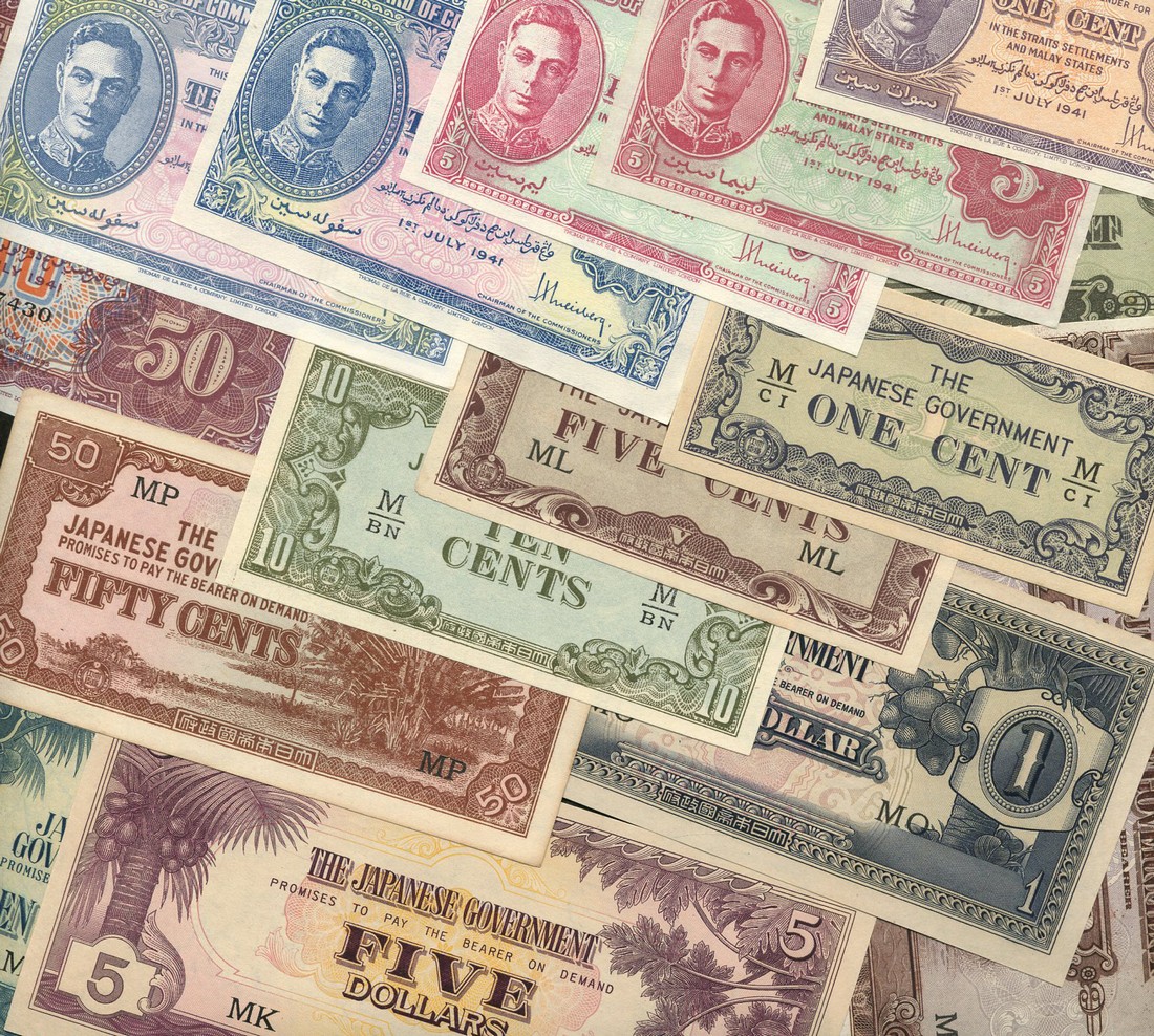 Board of Commissioners of Currency, Malaya, a small group comprising 10 cents, 15 August 1940, blue, pink and tan, 1 cent, 1941, lilac, 5 cents (2), 1941, red, both varieties, 10 cents, 1941, two colour shades, 50 cents, 1941, violet, all with George VI at left, also a group of Japanese Invasion notes