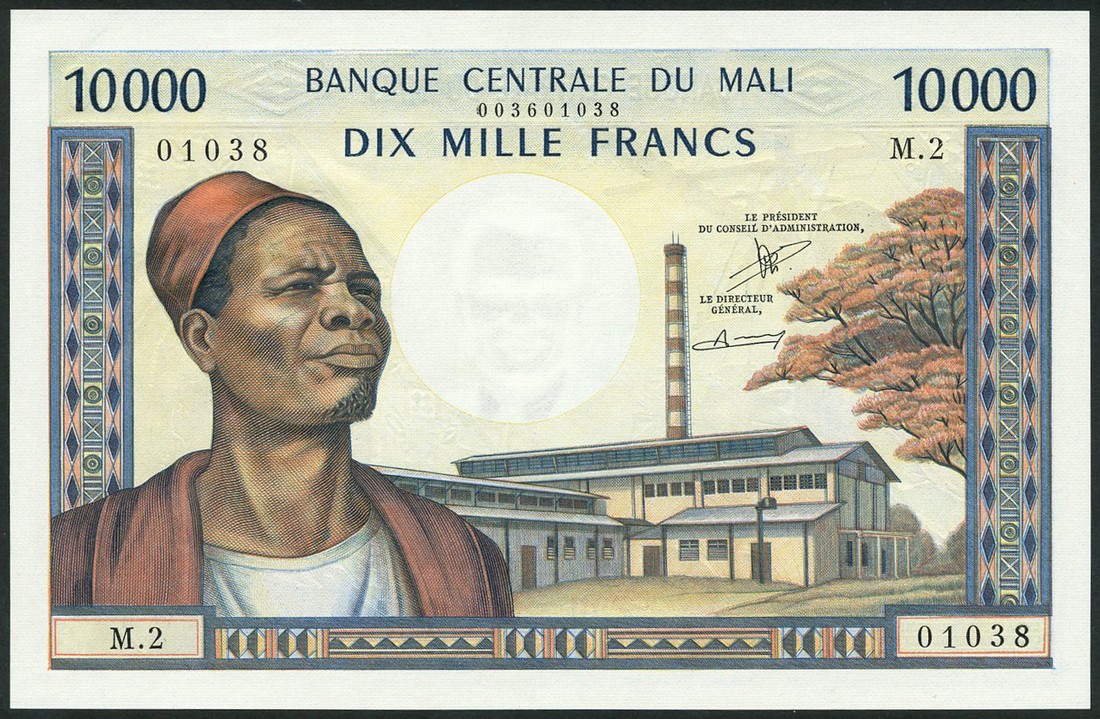 Banque Centrale du Mali, 10000 francs, ND (1970-84), serial number M.2 01038, multicolour, man with fez at left, factory at low right, Dusine and Makalou signatures, reverse young woman with coin headband at right, weaver at left
