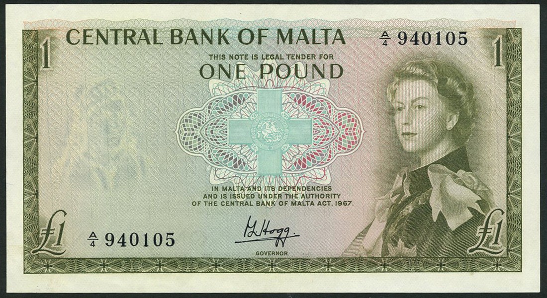 Central Bank of Malta, 10/-, ND (1968), serial number A/4 234152, red, and £1, ND (1969), serial number A/4 940105, olive green, both with Elizabeth II at right, George Cross at centre