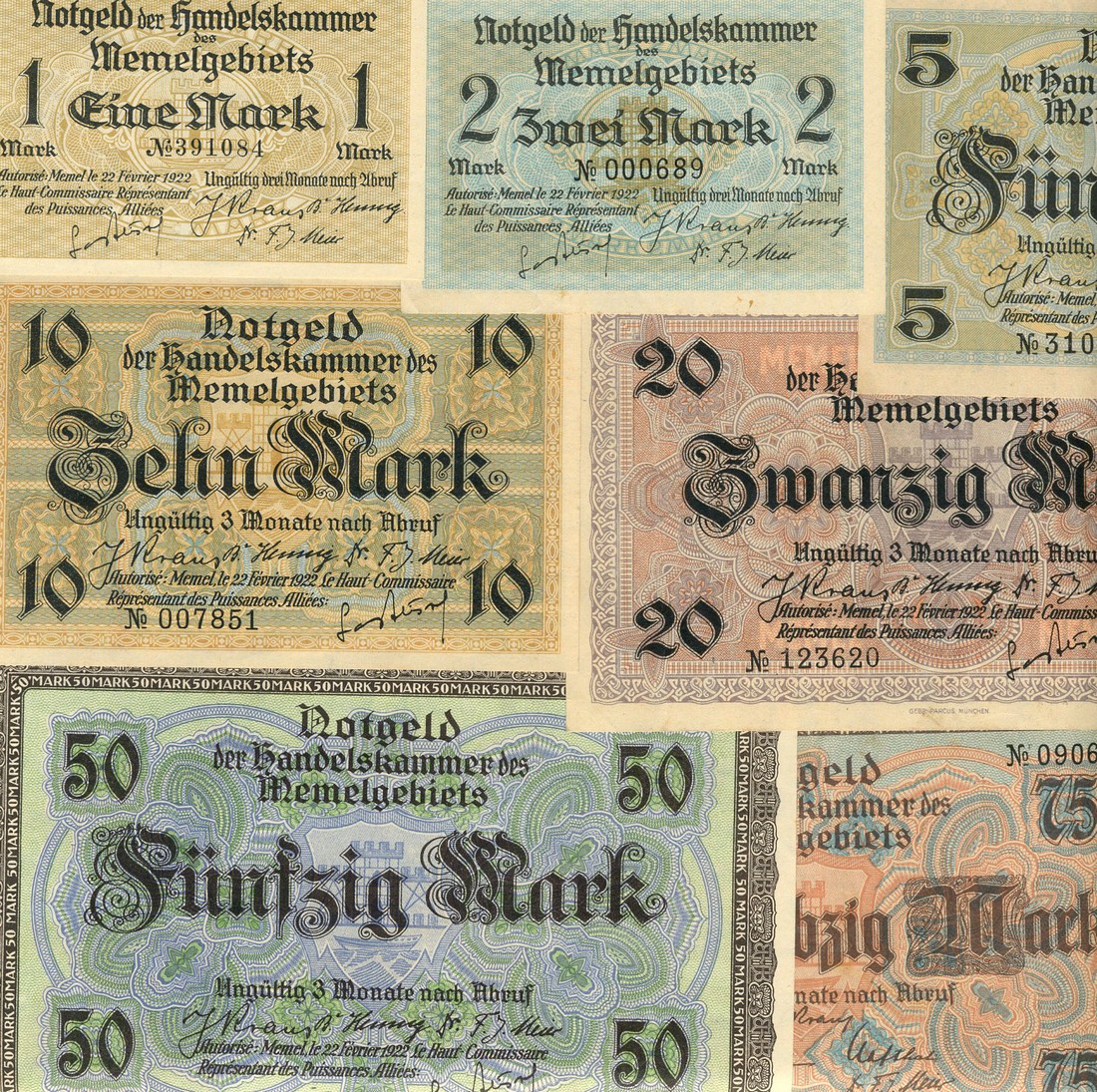 Memel Chamber of Commerce, a set of the 1922 issue, comprising 1/2, 1, 2, 5, 10, 20, 50 and 75 mark, all with black lettering on multicoloured underprints