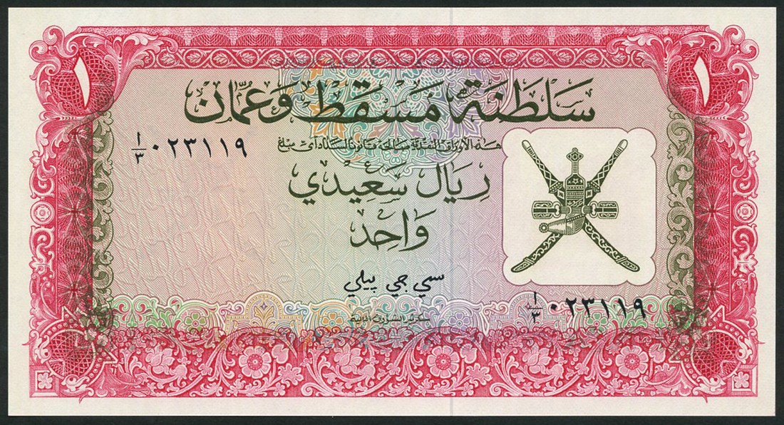 Sultanate of Muscat and Oman, 100 baiza, 1/4, 1/2 and 1 rial saidi, ND (1970), brown, blue, green and red respectively, all with arms at right, reverse castles and forts