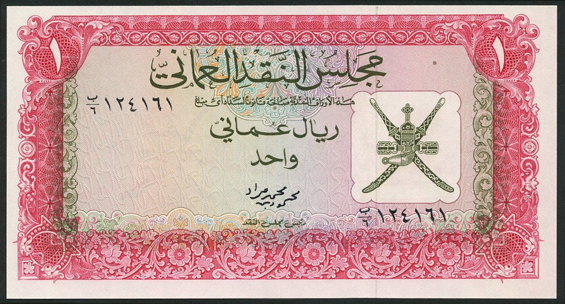 Oman Currency Board, 100 baiza, 1/4, 1/2 and 1 rial Omani, ND (1973), brown, blue, green and red respectively, all with arms at right, reverse castles and forts