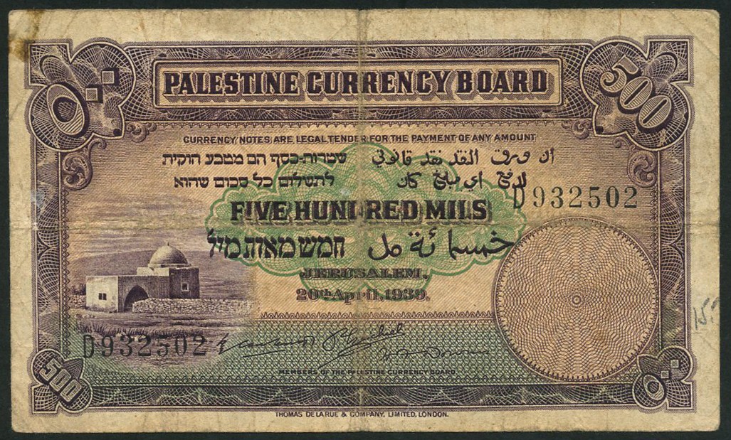 Palestine Currency Board, 500 mils, 30 September 1939, serial number D932502, purple on green underprint, Rachels Tomb near Bethlehem at left, value at each corner