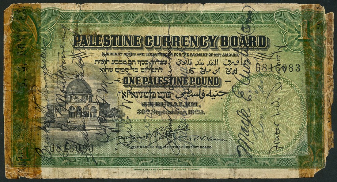 Palestine Currency Board, a "short snorter" £1, 30 September 1929, serial number G816083, green, Dome of the Rock at left, value at each corner