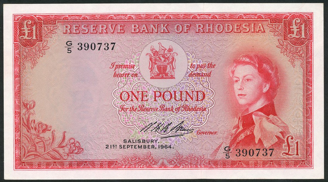 Reserve Bank of Rhodesia, 10 shillings, 28 October 1964, prefix H/5, blue, Elizabeth II at right, stone falcon low left, arms top centre, also £1, 21 September 1964, prefix G/5, red, Elizabeth II at right, arms top centre, flowers low left