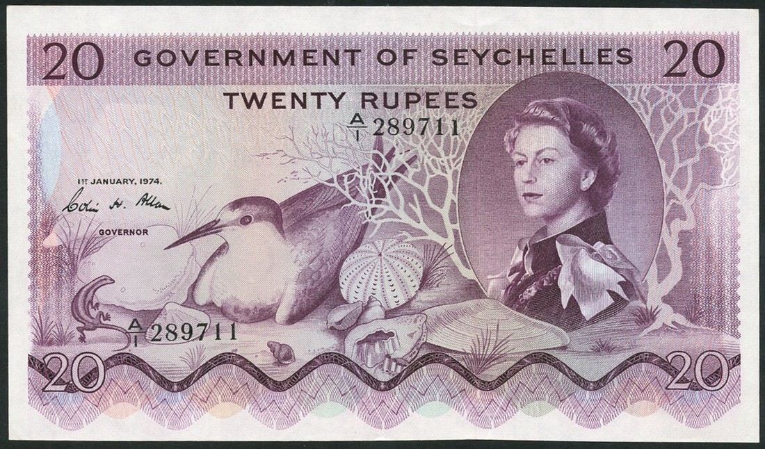 Government of Seychelles, 20 rupees, 1 January 1974, prefix A/1, purple, Elizabeth II at right, Sooty tern at left, Allan signature