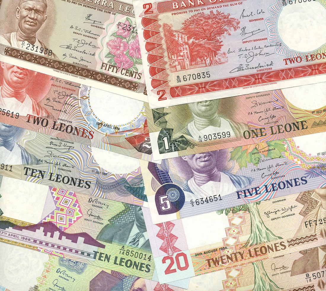 Bank of Sierra Leone, a group of notes including 1 leone, ND (1970), green, cottonwood tree and courthouse at left, also a number of other issues up to 2004, and several modern Liberia notes