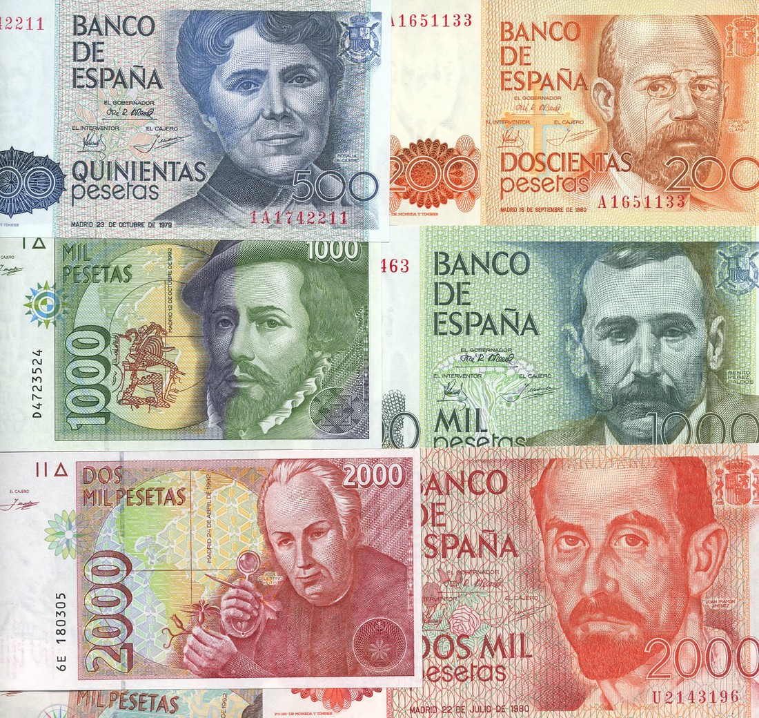Banco de Espana, 200, 500, 1000, 2000 and 5000 pesetas, 1982-87, last with King Juan Carlos I at right, 2000 pesetas, 1992 and 1000, 2000 and 5000 pesetas, 1996