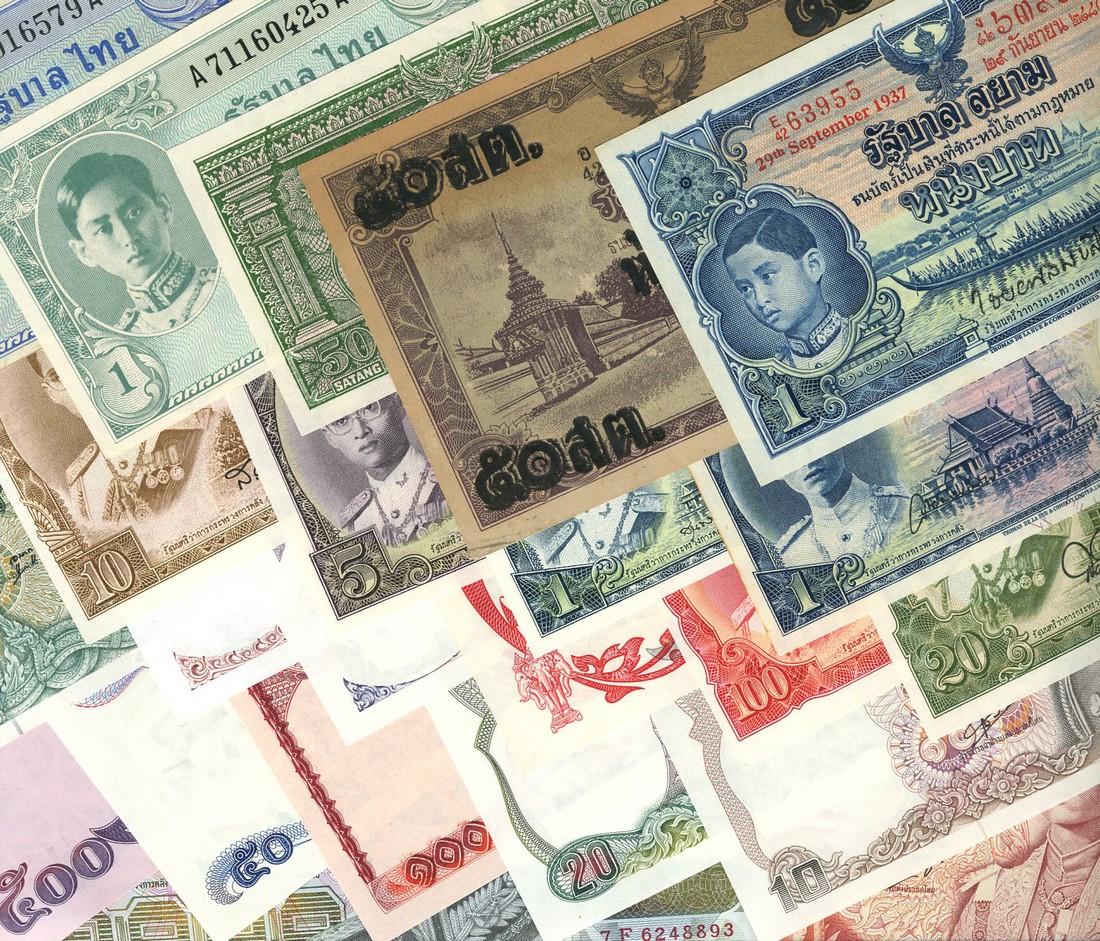 Thailand, 1 baht, 1934, and 1 baht, 1937, both blue, Kings Rama VII and Rama VIII respectively, dragon boat at centre, also a large group of other Thai issues, up to the present day