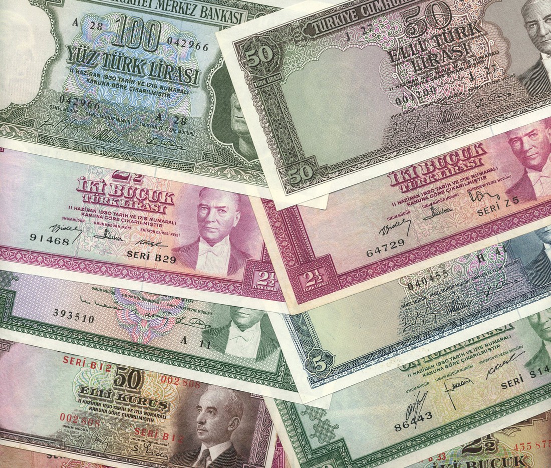 Central Bank of Turkey, 50, 100 and 500 lira, 1961-65 issue, green and purple respectively, Ataturk at right, also 2 1/2 (2), 5, and 10 (2) lira, 1951-60 issue, and several earlier issues