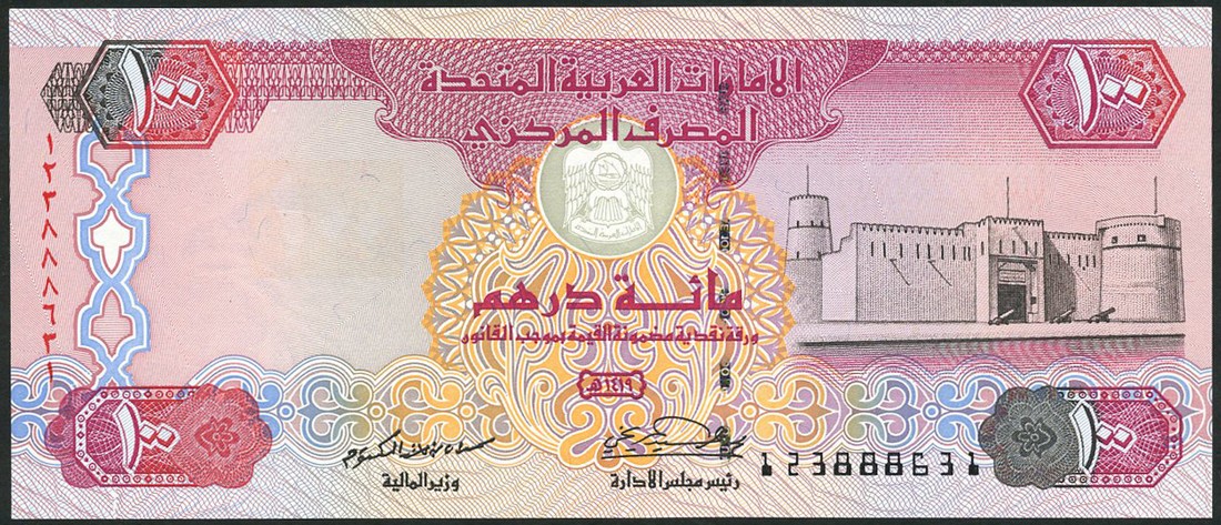United Arab Emirates Central Bank, a group of later issues, including 100 dirhams (2), 1998 and 2006, red, fort at right, arms at centre