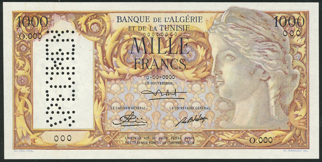 (x) Banque de l'Alergie et de la Tunisie, specimen 1000 francs, ND (1959), zero serial number, brown and yellow on multicolour, Isis at right, reverse farming scene, vertical hole punched "SPECIMEN" at left