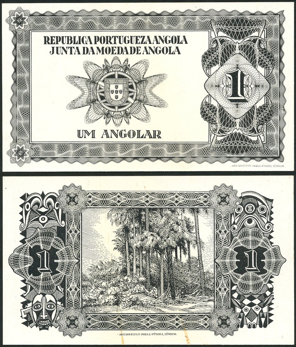 Republica Portugueza Angola, Junta da Moeda, an obverse and reverse essay for 1 angolar, black on white card, arms at centre, value at right, reverse rainforest at centre