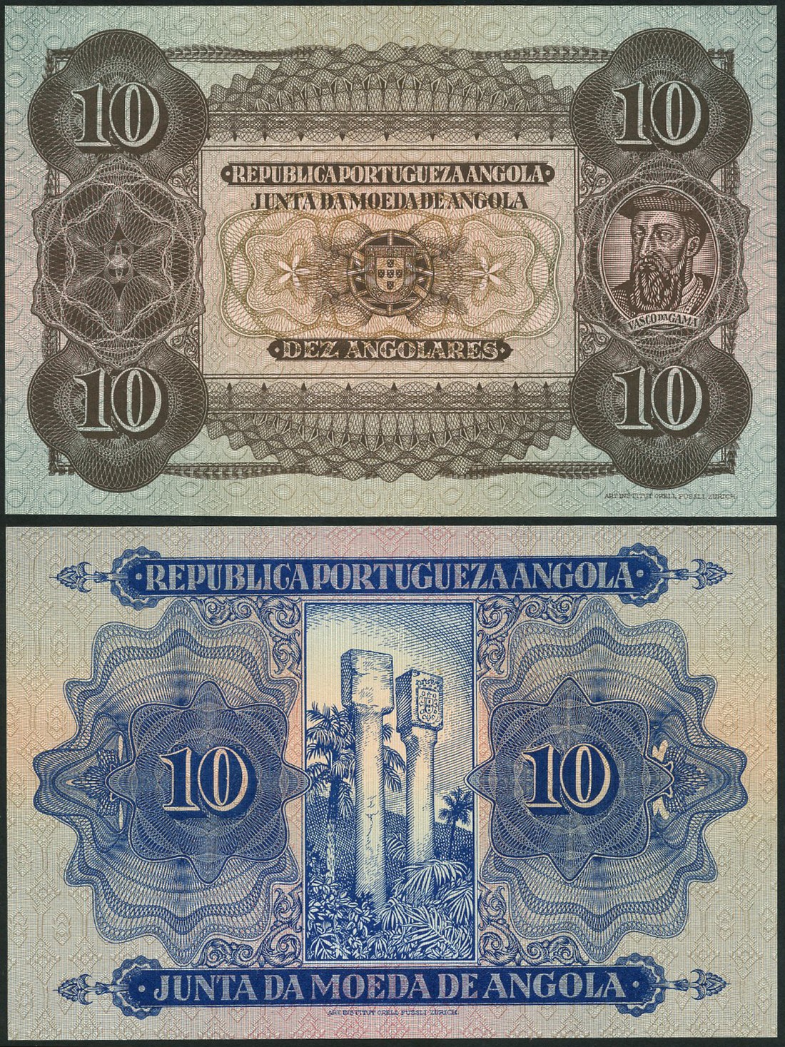 Republica Portugueza Angola, Junta da Moeda, an obverse and reverse essay for a 10 angolares, brown, pink and pale green, arms at centre, Vasco de Gama at right, reverse blue, columns at centre, value at left and right