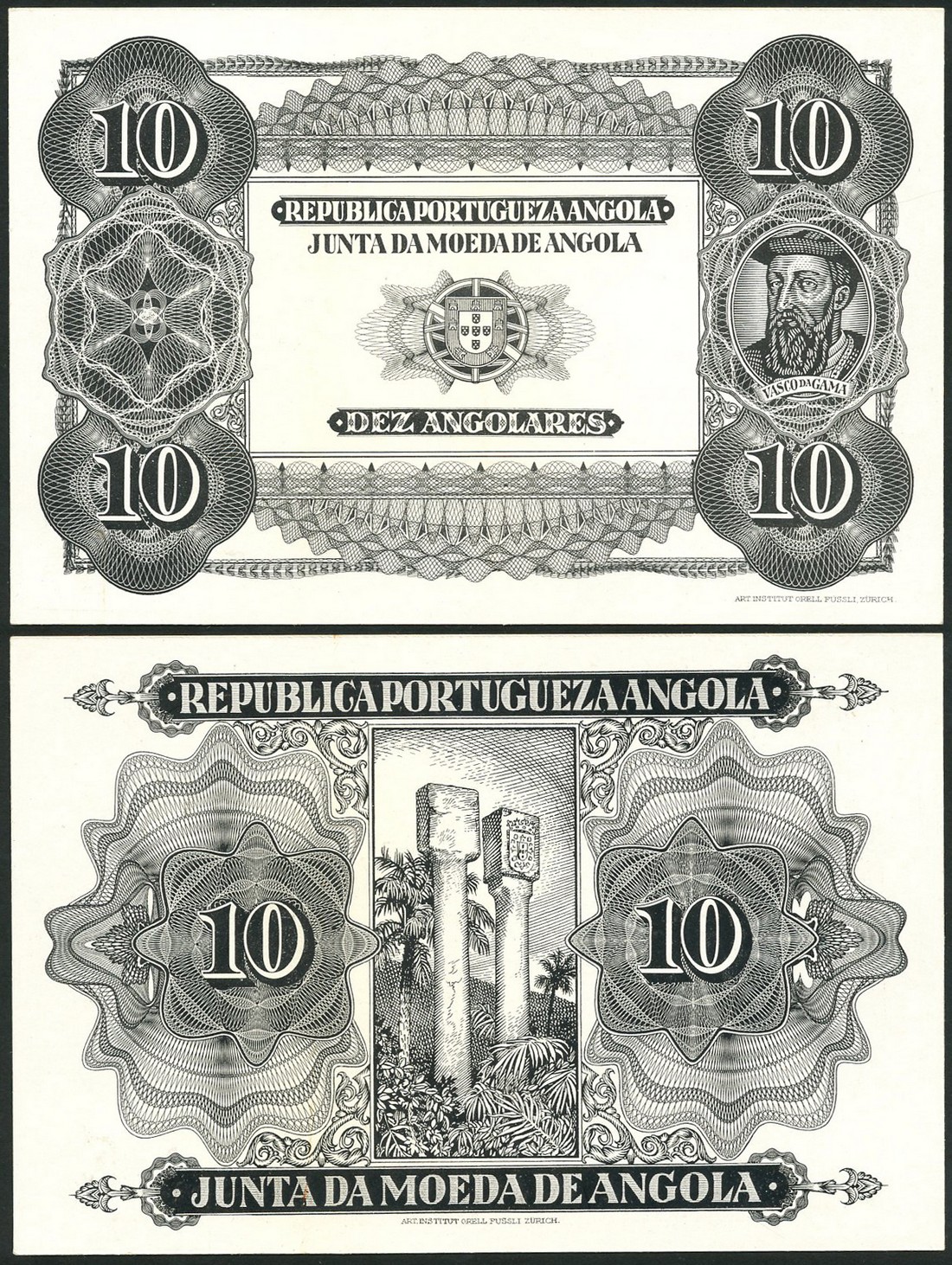 Republica Portugueza Angola, Junta da Moeda, an obverse and reverse essay for a 10 angolares, black on white card, Vasco da Gama at right, arms at centre,