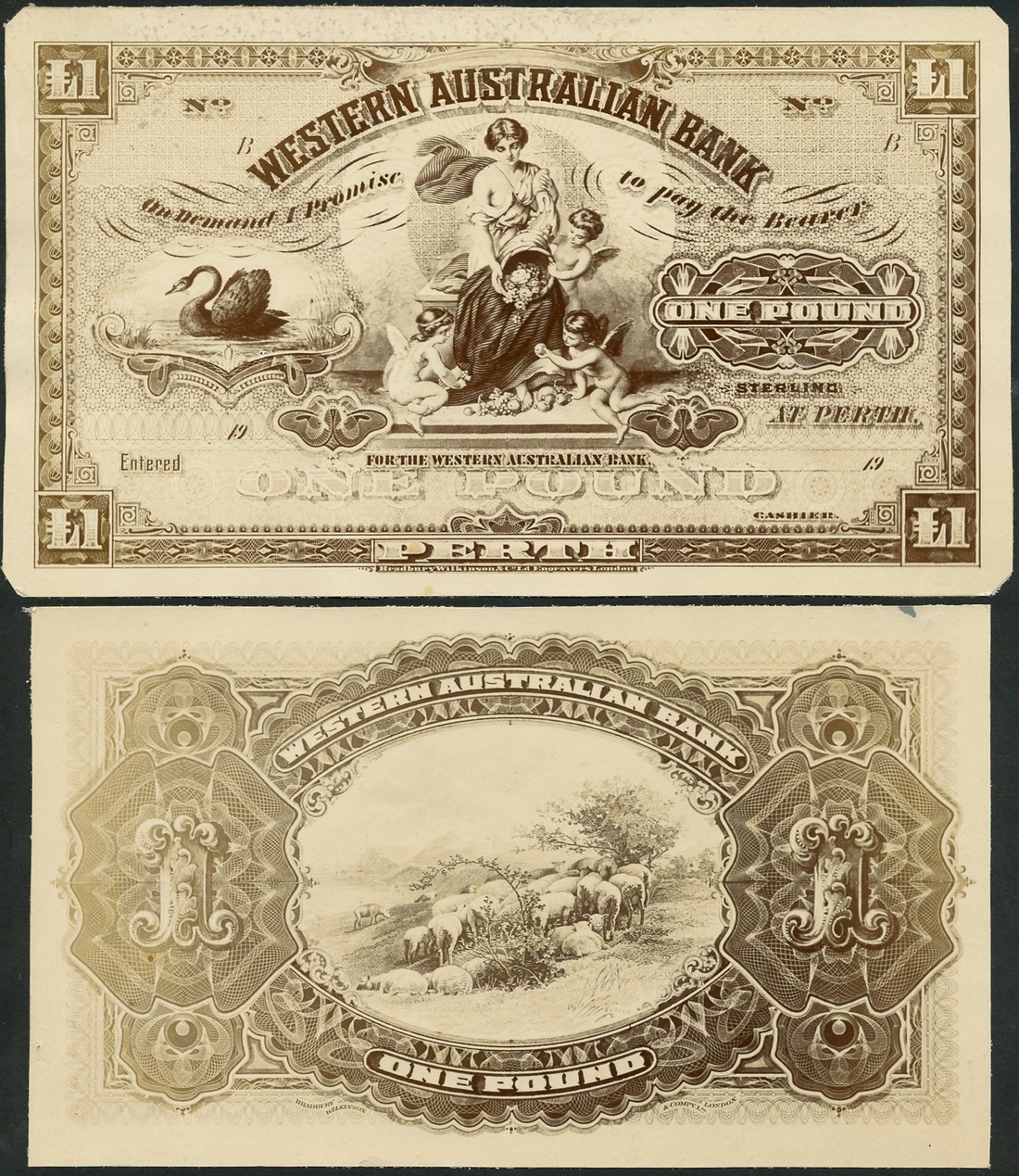 (†) Western Australia Bank, an obverse and reverse pair of archival photographs for a proposed issue of £1, Perth, 19-, black and white, allegorical maiden with cornucopia and cherubs at centre, black swan at left, reverse sheep at centre, value at left and right