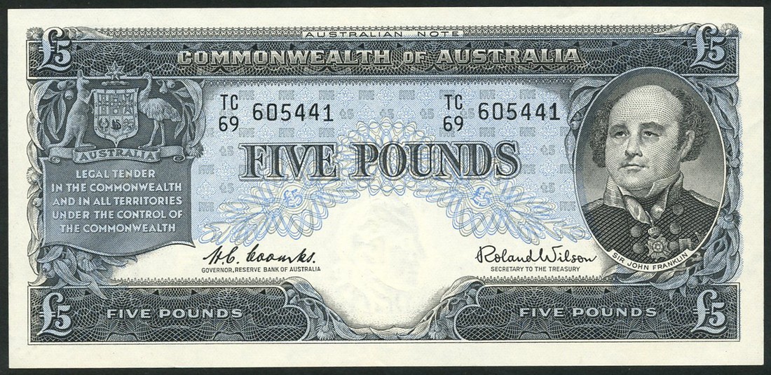 (x) Commonwealth of Australia, £5 (2), ND (1954), prefixes TC/69,TD/06, blue and multicoloured, Sir John Franklin at right, Coombs and Wilson signatures