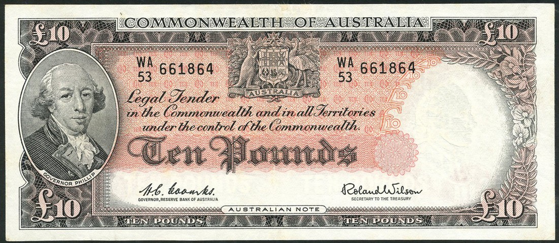 (x) Commonwealth of Australia, £10, ND (1960-65), serial number WA53 661864, black on red underprint, portrait Governor Arthur Phillip at left, arms top centre, Coombs/Wilson signature, reverse scientific and industrial symbols at centre,