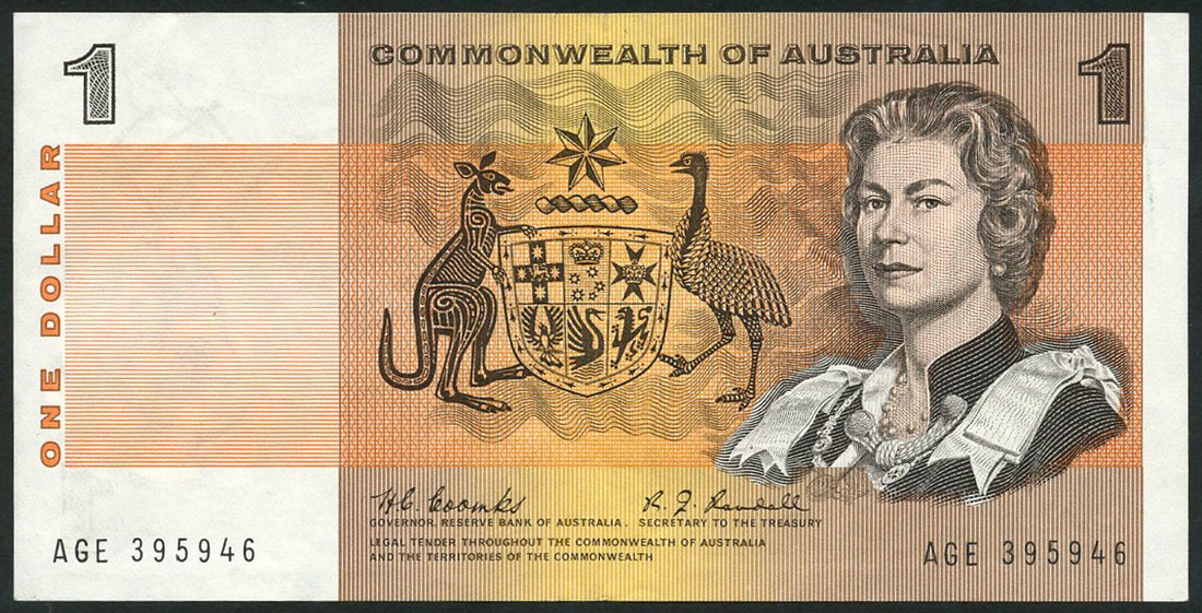 Commonwealth of Australia, $1, ND (1968), serial number AGE 395946, dark brown on yellow and orange underprint, Elizabeth II at right, arms at centre, Coombs-Randall signatures