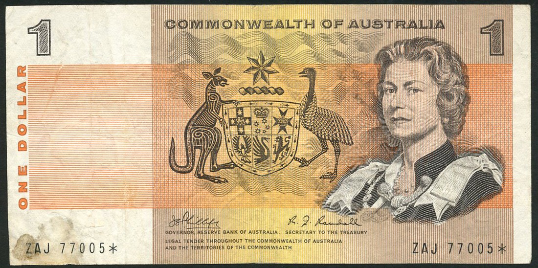 (x) Commonwealth of Australia, 1 dollar, ND (1969), serial number ZAJ 77005*, Phillips/Randall signature, dark brown on orange and multicolour underprint, Queen Elizabeth II at right, arms at centre, reverse aboriginal art