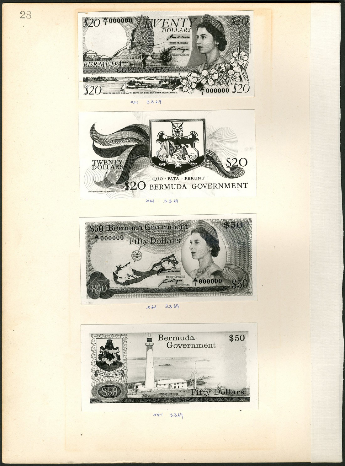 Bermuda Government issue, a set of printer's archival photographs for a proposed issue of currency comprising an obverse and reverse $5, Saint David's lighthouse at centre, $10, a cahow (Bermuda petrel) at centre, $20, Somerset Bridge and tern at centre, all arms of Bermuda 'QUO FATA FERUNT' at centre, also $50, map of Bermuda at centre, reverse arms top left and Gibb's Hill lighthouse at centre. All are undated but annotation from printers '3.3.69', the decimal system introduced 6 February 1970. All serial number A/1 000000 and Elizabeth II wearing Queen Alexandra Kokoshnik's tiara at right and all with signatures of John Sharpe and C.W.Kempe
