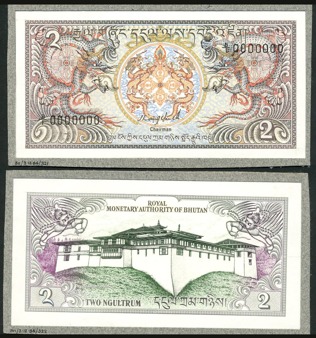(†) Royal Monetary Authority of Bhutan, an obverse and reverse composite essay for a 2 ngultrum, ND (ca 1984), serial number B/1 00000000, brown and multicoloured, Royal emblem and dragons, reverse Simtokha Dzong palace at centre