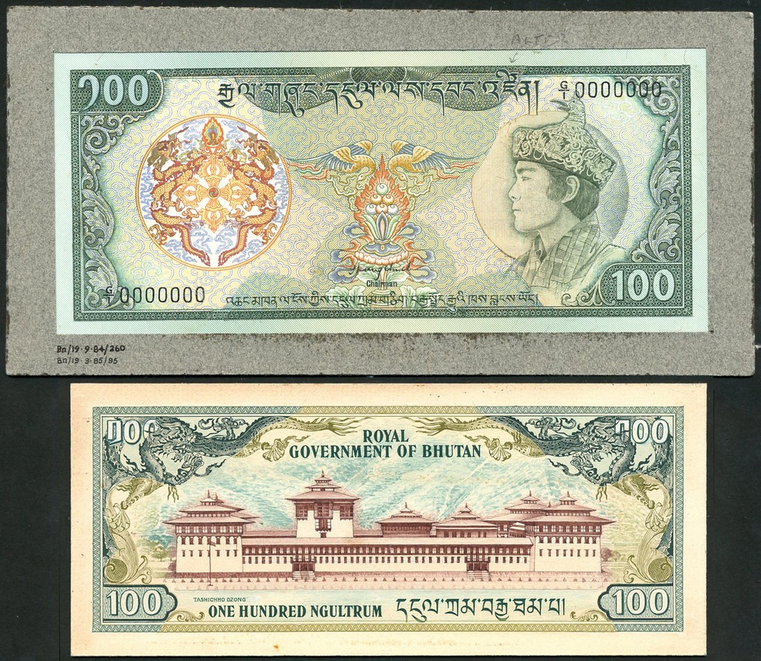 (†) Royal Government of Bhutan, an obverse and reverse composite essay for a 100 ngultrums, ND (ca 1984), serial number G/1 0000000, green and multicoloured, J.Singye Wangchuk at right, Royal emblem at left, reverse green, the Paro Dzong Palace at centre