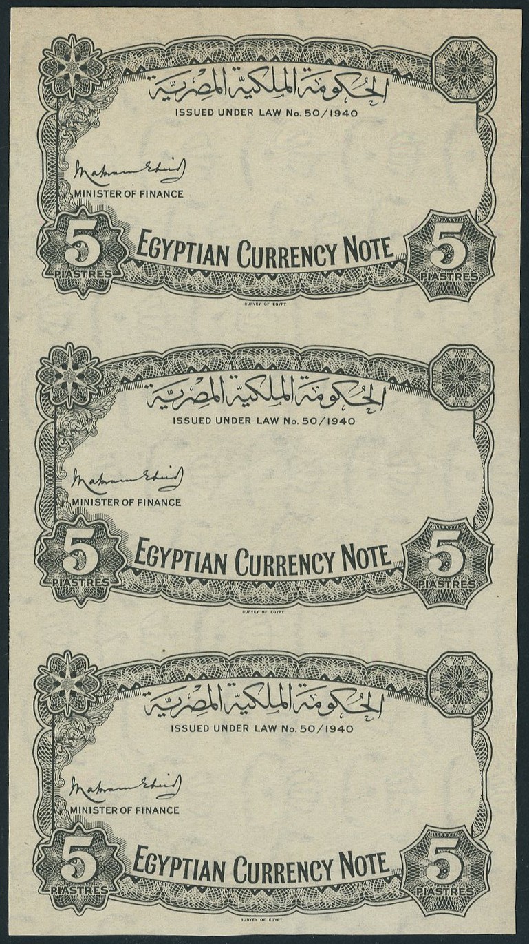 Egyptian Government Currency note, a sheet of three 'Printer's essay' 5 piastres, law of 1940, black and white, value low left and right