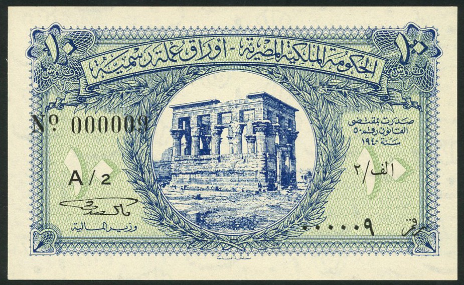Egyptian Government Currency note, 10 piastres, law of 1940, serial number A/2 000009, pale green and blue, the Temple at Philae at centre, value top left and right, reverse pale green and pink, value low left and right