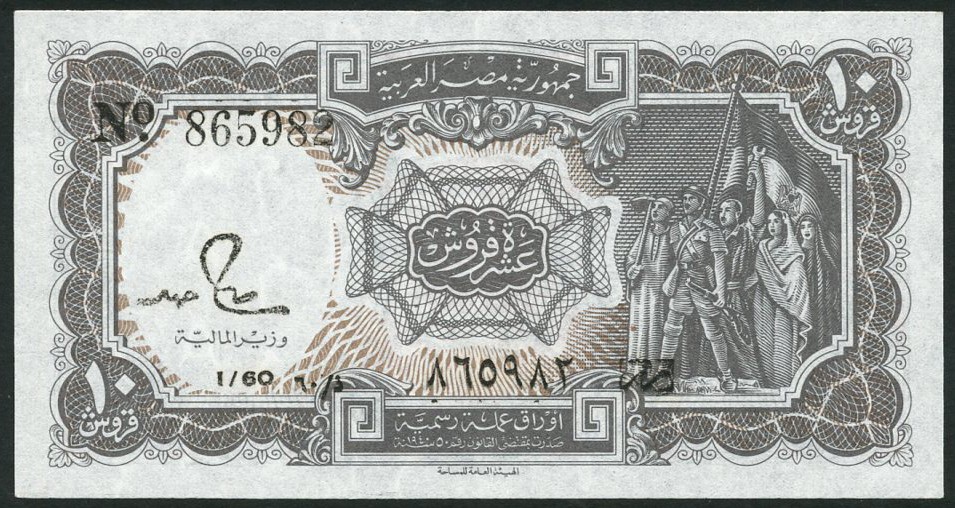 United Arab Republic Currency note, 10 piastres, 1958, serial number O/13 000001, blue-grey and brown, Egyptians at right with flag with hawk emblem, Salah Hamed signature (13) including Z/60 000001 and El Razaz signature (8) including H/73 000001/2, reverse pink and green, value