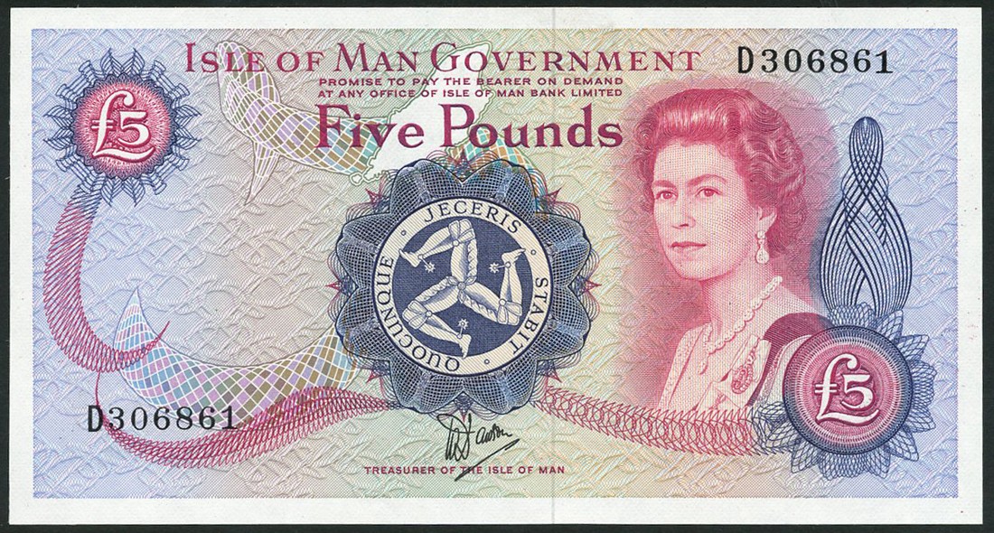 Isle of Man Government, £5 (3), ND (1987), serial numbers D 306861/62/63 (sans serif), signature Dawson, purple and blue on multicoloured underprint, portrait of Queen Elizabeth II by Anthony Buckley at right, triskeles at centre, reverse grey-green, Castle Rushen,