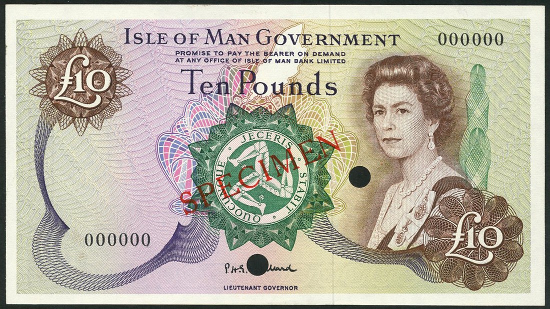 Isle of Man Government, specimen £10, ND (1972), serial number 000000, signature Stallard, brown and dark green on multicoloured underprint, portrait of Queen Elizabeth II by Anthony Buckley at right, triskeles at centre, reverse brown and orange, Peel Castle, overprinted SPECIMEN diagonally in red on obverse, two punch holes