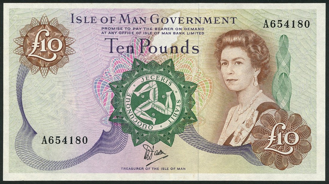 Isle of Man Government, £10, ND (1984), serial number A 654180, signature Dawson, brown and dark green on multicoloured underprint, portrait of Queen Elizabeth II by Anthony Buckley at right, triskeles at centre, reverse brown and orange, Peel Castle