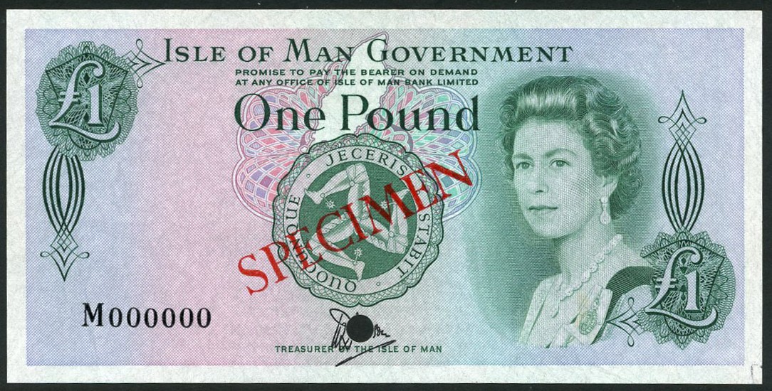 Isle of Man Government, specimen £1 printed on bradvek polymer, ND (1983), serial number M 000000, signature Dawson, green and multicoloured, portrait of Queen Elizabeth II by Anthony Buckley at right, triskeles at centre, reverse St. John's Church on Tynwald Hill, overprinted SPECIMEN diagonally in red on obverse and reverse, one punch hole