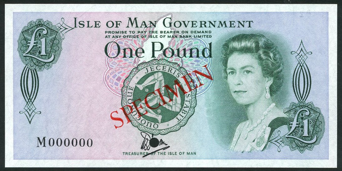 Isle of Man Government, specimen £1 printed on bradvek polymer, ND (1983), serial number M 000000, signature Dawson, green and multicoloured, portrait of Queen Elizabeth II by Anthony Buckley at right, triskeles at centre, reverse St. John's Church on Tynwald Hill, SPECIMEN 492 in black in top margin, overprinted SPECIMEN diagonally in red on obverse and reverse, one punch hole
